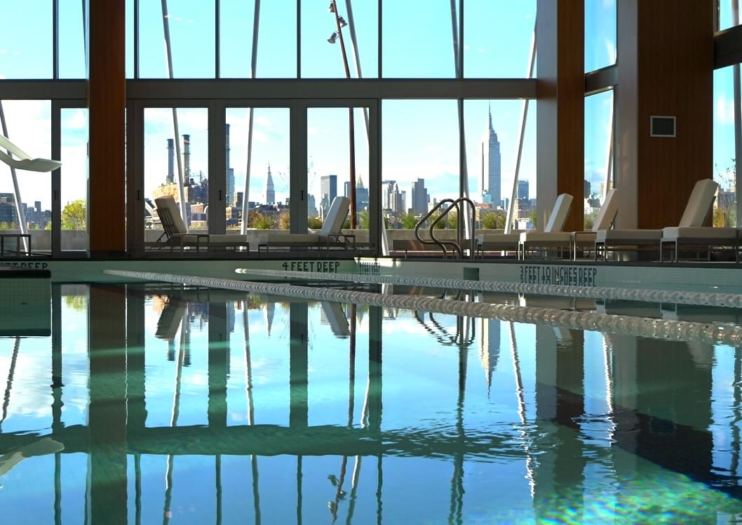 Ad uso esclusivo dei residenti, oltre a palestra, sauna e business center, c’è una oramai famosa piscina con porte a vetro retrattili e vista diretta sullo skyline di Manhattan, per nuotate da mille e una notte.